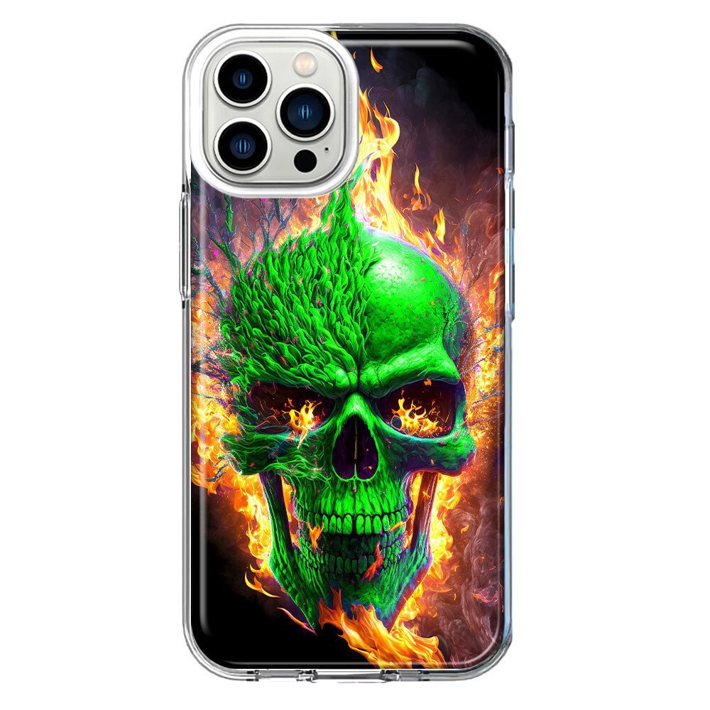For Apple Iphone 13 Pro Max Shockproof Hybrid Case, Green Flaming Fire Skull